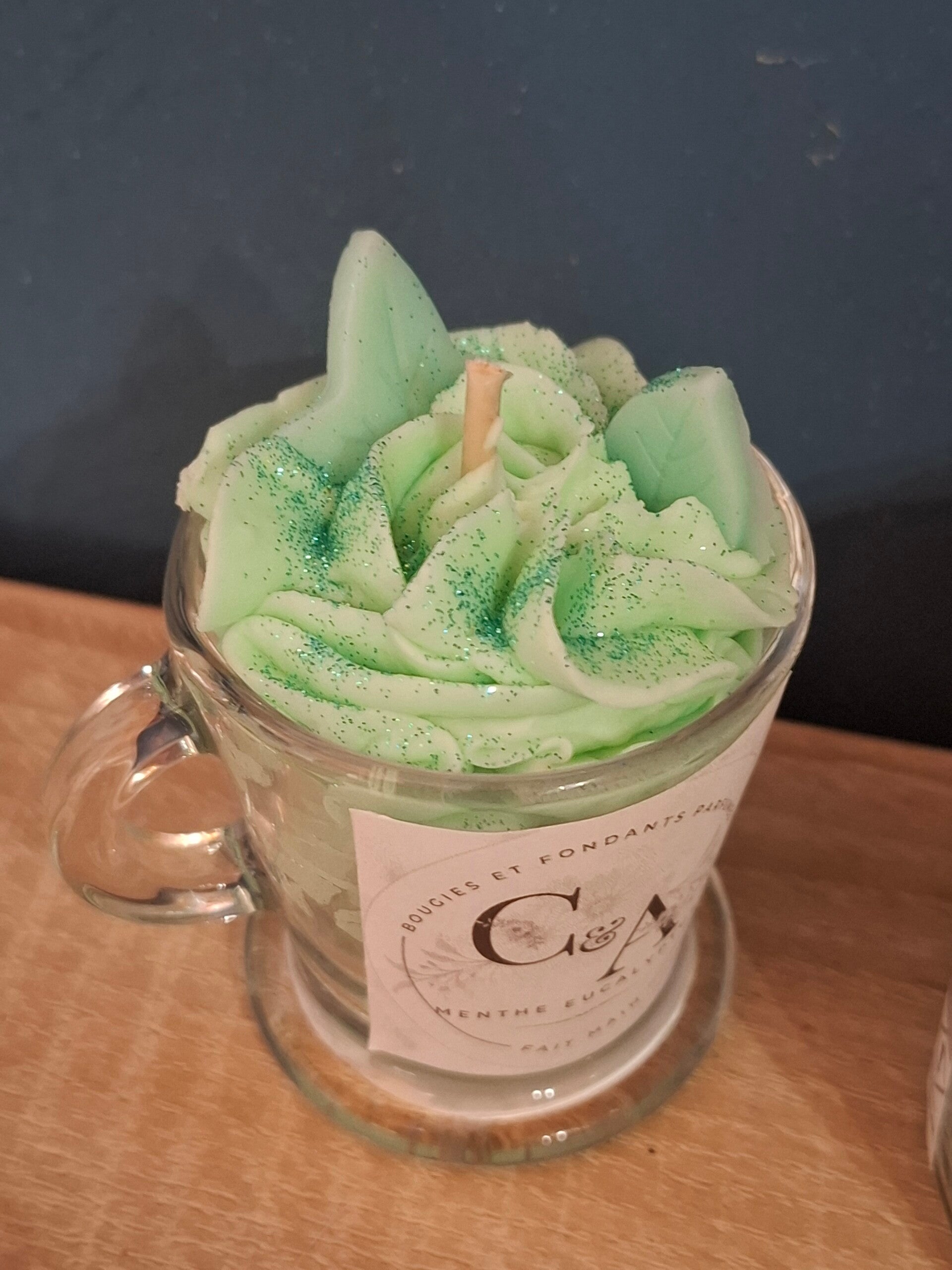 Bougie gourmande senteur Menthe eucalyptus à la cire végétale et au parfum de la ville de Grasse faite main.